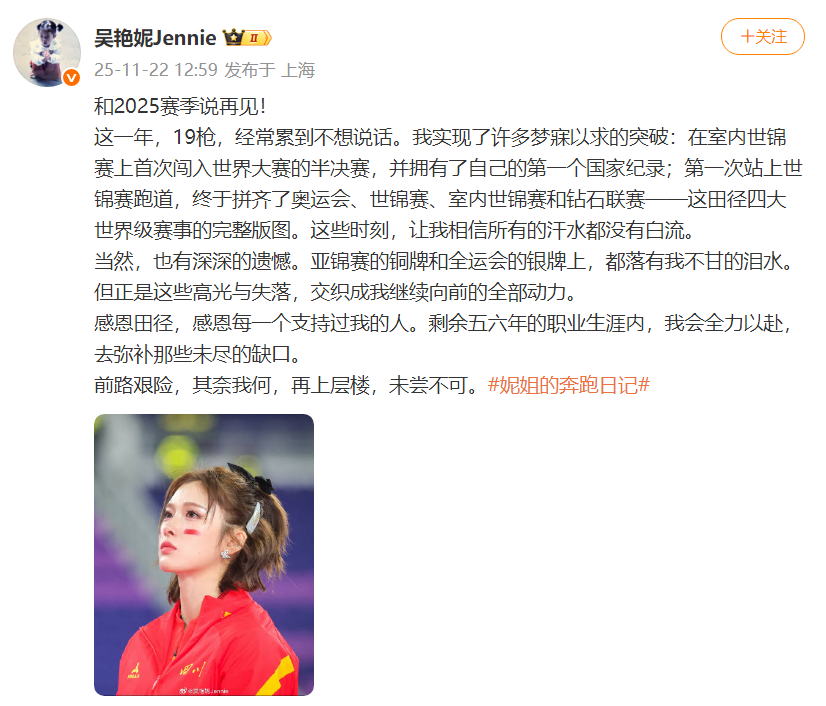 感恩田径,感恩每一个支持过我的人。剩余五六年的职业生涯内,我会全力以赴,去弥补那些未尽的缺口。