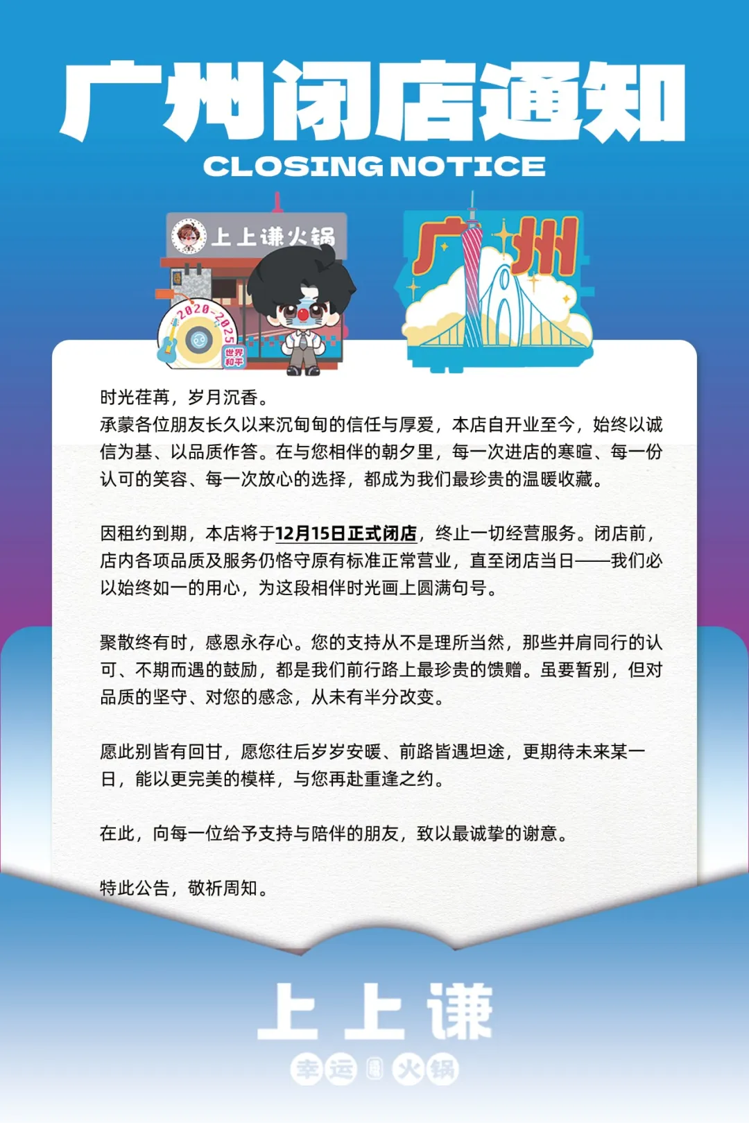 近日,火锅品牌上上谦微信公众号发布一则“广州闭店通知”。其中提到,上上谦广州店因租约到期,将于12月15日正式闭店,终止一切经营服务。