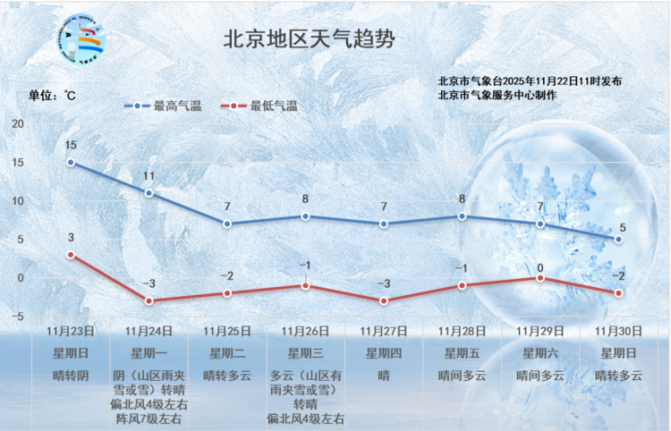 下周三(26日)冷空气补充再入京,山区有雨夹雪或雪,北风再起,风寒效应明显,还请大家及时关注临近预报,提前做好防范。